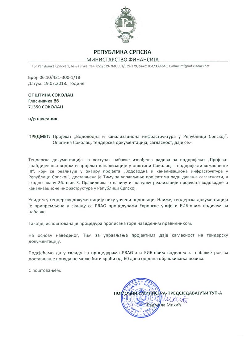 Тим за управљање пројектима при Министарству финансија Републике Српске дао је сагласност општини Соколац за тендерску документацију за компоненту III пројекта „Снабдјевање водом и пројекат канализације у општини Соколац“ који се имплементира у склопу пројекта „Водоводна и канализациона инфраструктура у Републици Српској“.