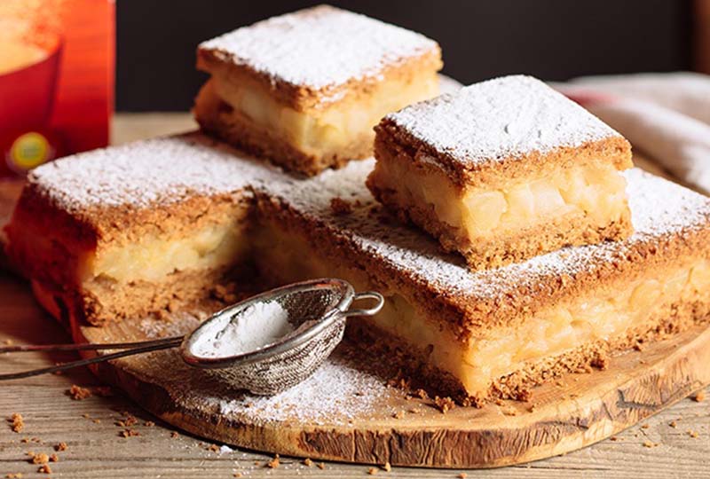 Рерну загрејте на 180°Ц. Плех за печење припремите тако што ћете га премазати са мало путера или масти. Тесто извадите из фрижидера и поделите га на два дела. Једним обложите плех па равномерно распоредите фил преко њега. Другу половину теста ставите на већи лист папира за печење и оклагијом развуците на димензије плеха. Виљушком избоцкајте тесто па га пажљиво уз помоћ папира за печење положите преко фила од јабука. Одлепите папир па питу ставите у рерну да се пече 40–45 минута. Извадите је из рерне и оставите да се охлади, а затим је исеците на коцке и поспите шећером у праху.
