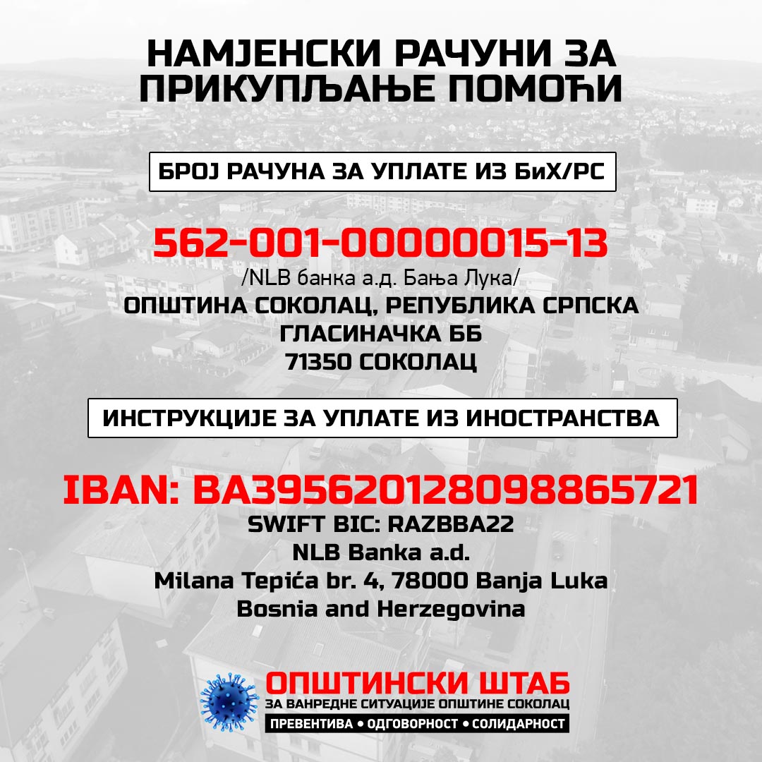 Од данас су активни намјенски рачуни за прикупљање помоћи за набавку медицинске опреме и помоћ социјално угроженим лицима на територији општине Соколац, који ће представљати својеврстан фонд на који ће бити уплаћена одређена средстава из општинског буџета, као и добровољне донације овдашњих привредника, јавних предузећа и грађана који имају могућност и жељу да личним прилозима подрже ову акцију.