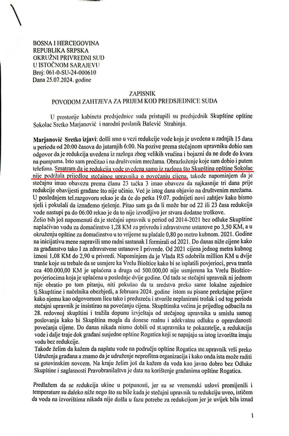 У записнику који је доступан јавности, види се изјава Сретка Марјановића који децидно наводи да је редукција воде уведена само из разлога што Скупштина општине Соколац није подржала приједлог стечајној управника о повећању цијена. Дакле, управо оно што је портал „Соколац-срце Романије“ објављивао, а не оно чиме нас бомбардују поједини одборници свих ових 12 дана.