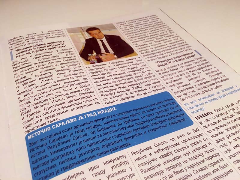 ВУКОВИЋ: Сарадња се креће од конкретне до протоколарне. Постоје институције које показују озбиљност и одговорност и имају добру сарадњу са Источним Сарајевом, помажу и општинама и становништву овог подручја. Са друге стране су поједина министарства и институције које показују неозбиљност игноришући на неки начин становништво овог краја. Не бих именовао било кога, само ћу рећи да смо ми припремили бројне пројекте на подручју града. Имамо у свом саставу Развојну агенцију (РАИС) која може да помогне и општинама у саставу града и привреди. Ми од институција Републике Српске, од оних са БиХ нивоа и међународних организација очекујемо највећу сарадњу управо са Развојном агенцијом која делегира и реализује пројекте на подручју града. Надам се да ћемо у наредном периоду имати бољу сарадњу.Са наше стране не постоје политички проблеми или било који други разлози да не унаприједимо сарадњу.