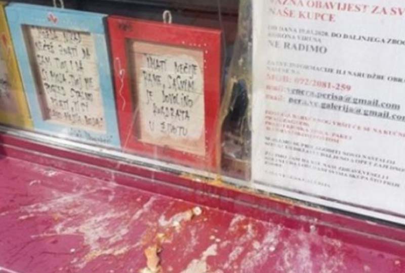 „Драги сусједи овако изгледа излог моје продавнице након што је јуче неко бацао јаја на неке особе које су се окупљале и пиле испред продавнице“, написала је власница објекта.