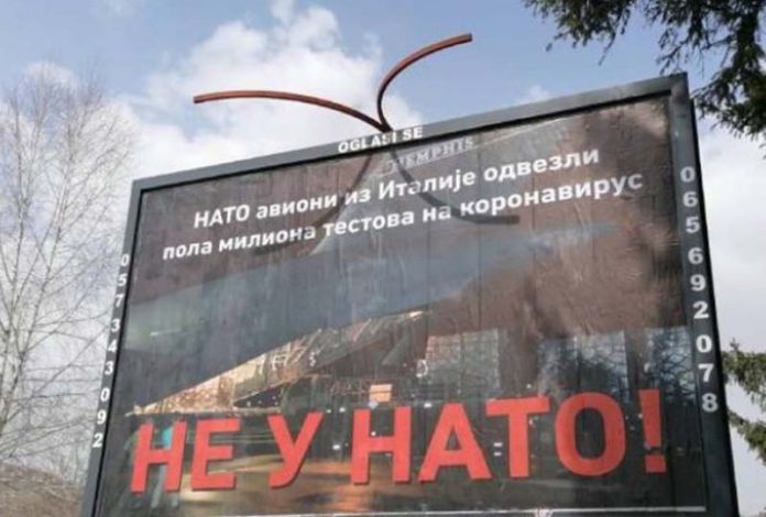 На билбордима се такође наводи да су НАТО авиони из Италије одвезли пола милиона тестова на вирус корона.