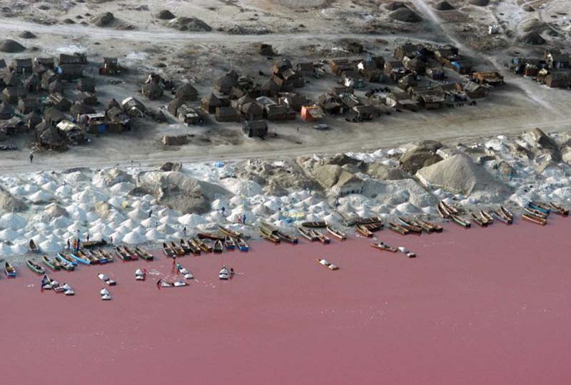 Необично афричко језеро розе нијансу дугује алги Dunaliella салина, а боја је најинтензивнија током сушних раздобља. За време кишне сезоне, од јула до окторбра вода поприма боју цигле.