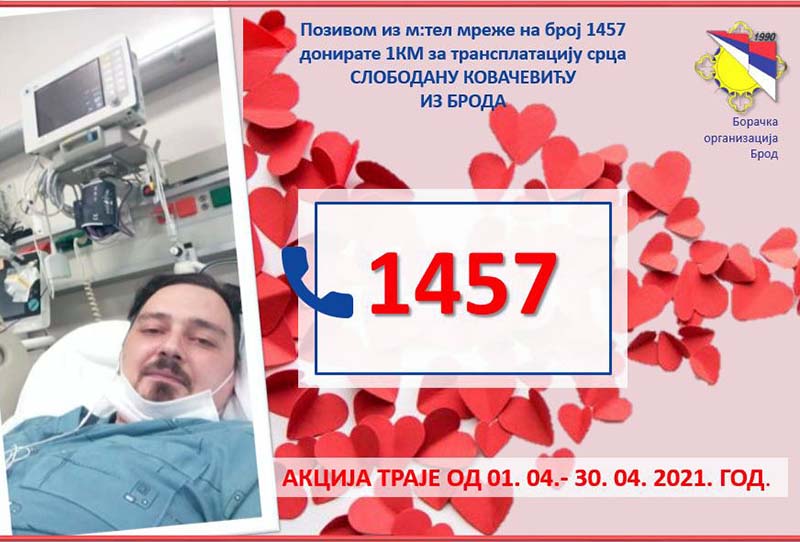 За лијечење тридесетогодишњег Слободана Ковачевића из Брода, којем су потребна новчана средства за трансплантацију срца, отворен је хуманитарни број 1457 путем којег је могуће донирати једну КМ.