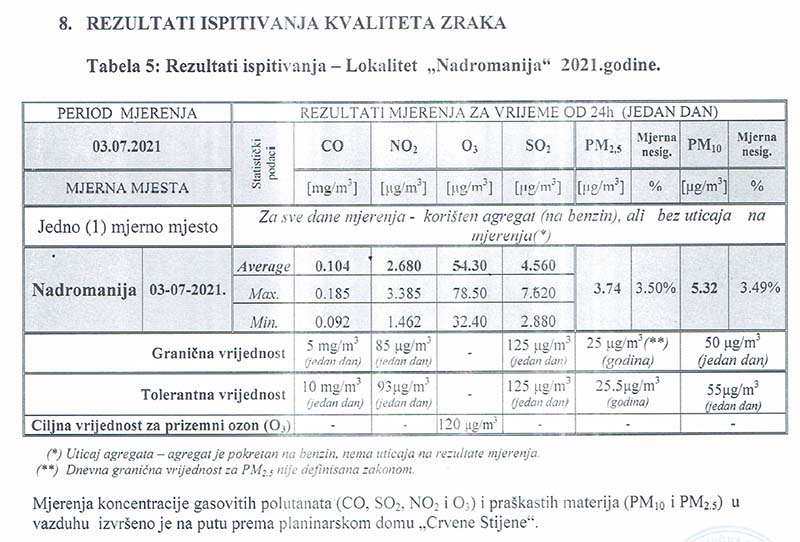 Мониторинг квалитета ваздуха у 2021. години, рађен је на локацији Надроманија – Видиковац – Црвене стијене. Резултати испитивања квалитета ваздуха показују да је циљна вриједност за приземни О3 120уг/м3, (озон 54,30%). Загађујуће честице су испод дозвољене границе, према стандардима и нормама ЕУ, што представља предуслов за унапређење здравственог туризма на Романији.