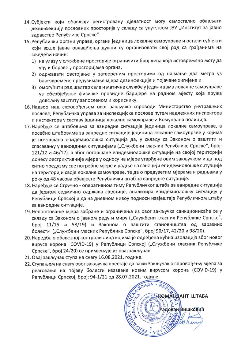 Републички штаб за ванредне ситуације донио је данас Закључак о спровођењу мјера за реаговање на појаву болести изазване вирусом корона у Републици Српској, којим је досадашње мјере продужио до 30. августа 2021. године.