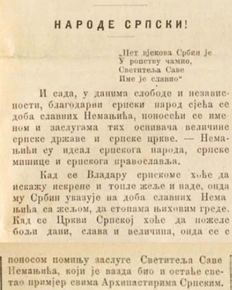 – Кад се владару српском хоће да искажу искрене и топпле жеље и наде, онда му Србин указује на доба славних Немањића са жељом да стопама њиховим греде, пише у тексту у ком се додаје и осјећај поноса при помену Светог Саве, који је, како је објашњавао овај лист, увијек био и остаће примјер свим српским духовним вођама.