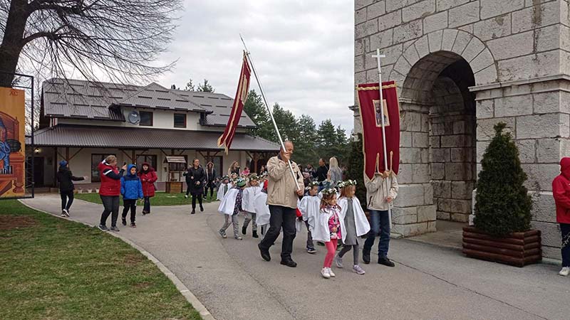 Око 50 малишана соколачког вртића, у сарадњи са свештеницима цркве Светог пророка Илије на Сокоцу, обиљежили су на традиционалан начин празник Лазарева субота литијом око храма.