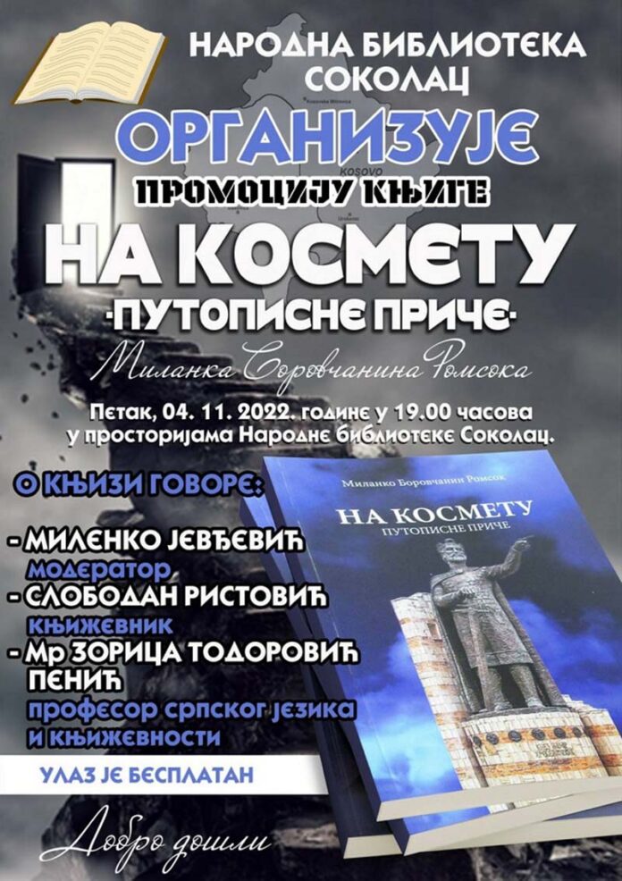 У петак, 4. новембра, Народна библиотека Соколац организује промоцију књиге „На Космету“, соколачког књижевника Миланка Боровчанина Ромсока. Ријеч је о путописним причама, а о књизи ће говорити: модератор Миленко Јевђевић, књижевник Слободан Ристовић и професор српског језика и књижевности мр Зорица Тодоровић Пенић.