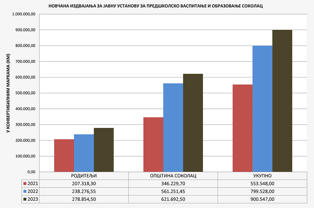 У 2023. години за услуге вртића родитељи су уплатили 278.854,50 КМ, док је општина Соколац уплатила 621.692,50 КМ.