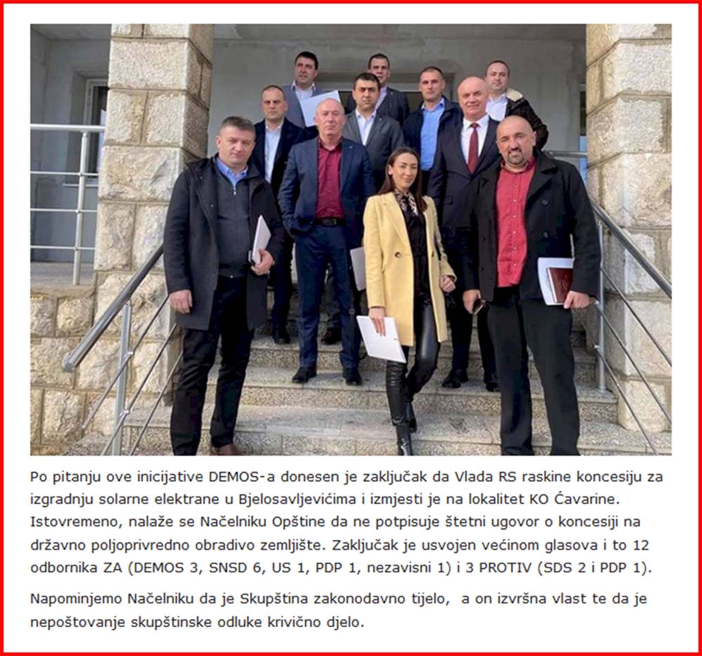 Закључак је на иницијативу Клуба одборника ДЕМОС усвојен већином гласова 12 одборника и то ДЕМОС 3, СНСД 6, УС 1, ПДП 1 и наводни независни одборник 1.