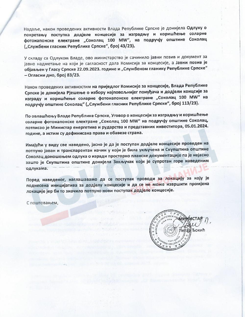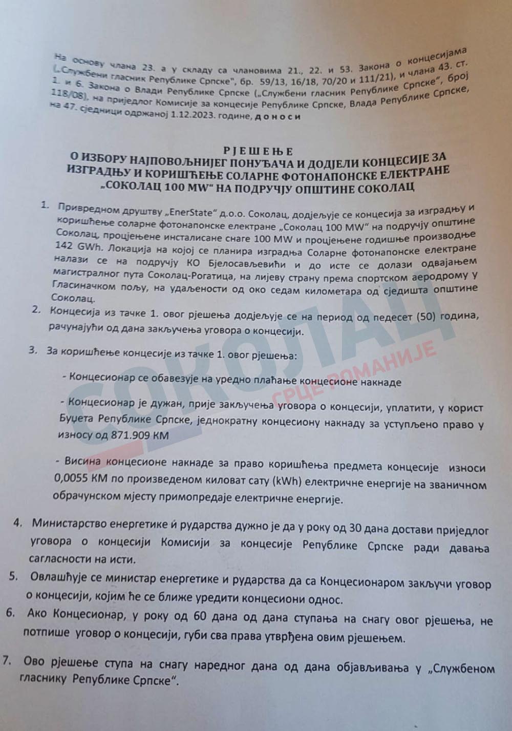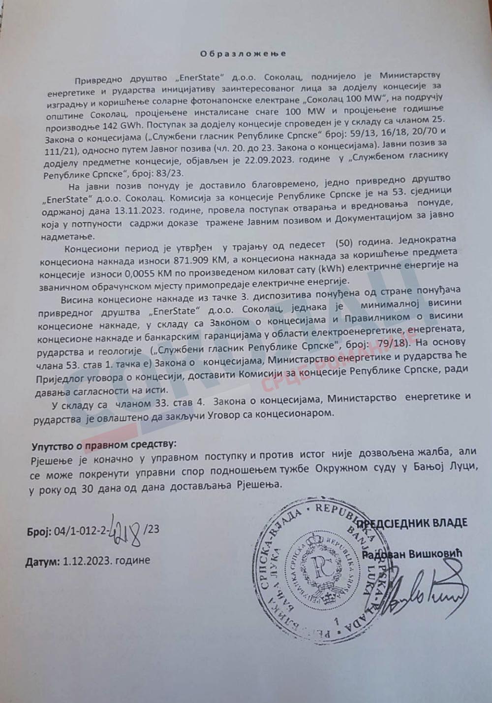 Да подсјетио, Влада Републике Српске је на 47.сједници одржаној 01.12.2023. донијела Рјешење о избору најповољнијег понуђача и додјели концесије за изградњу и кориштење соларне фотонапонске електране „Соколац 100 MW“ на подручју општине Соколац, а исто је објављено у Службеном гласнику Републике Српске 26.децембра 2023.године.