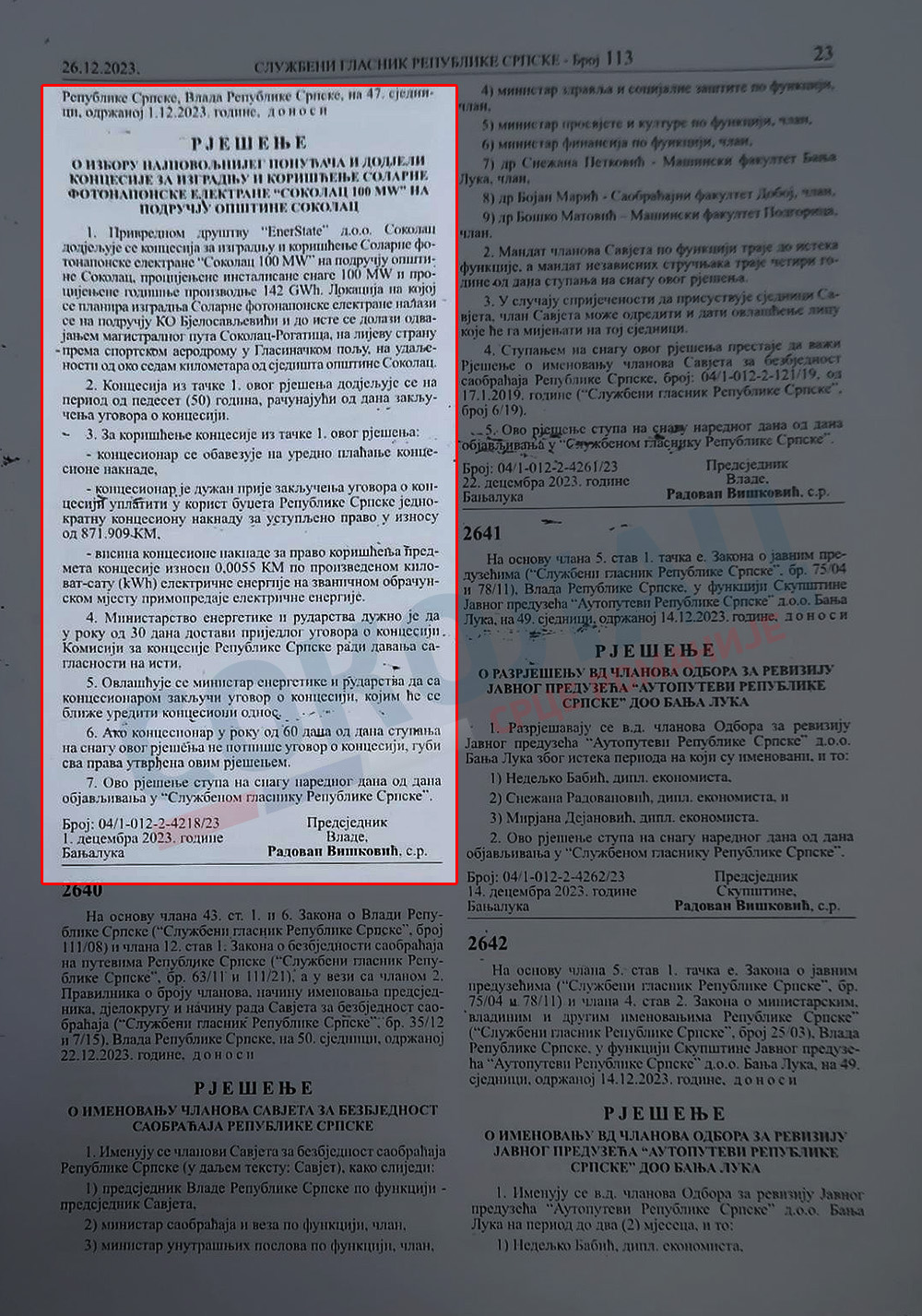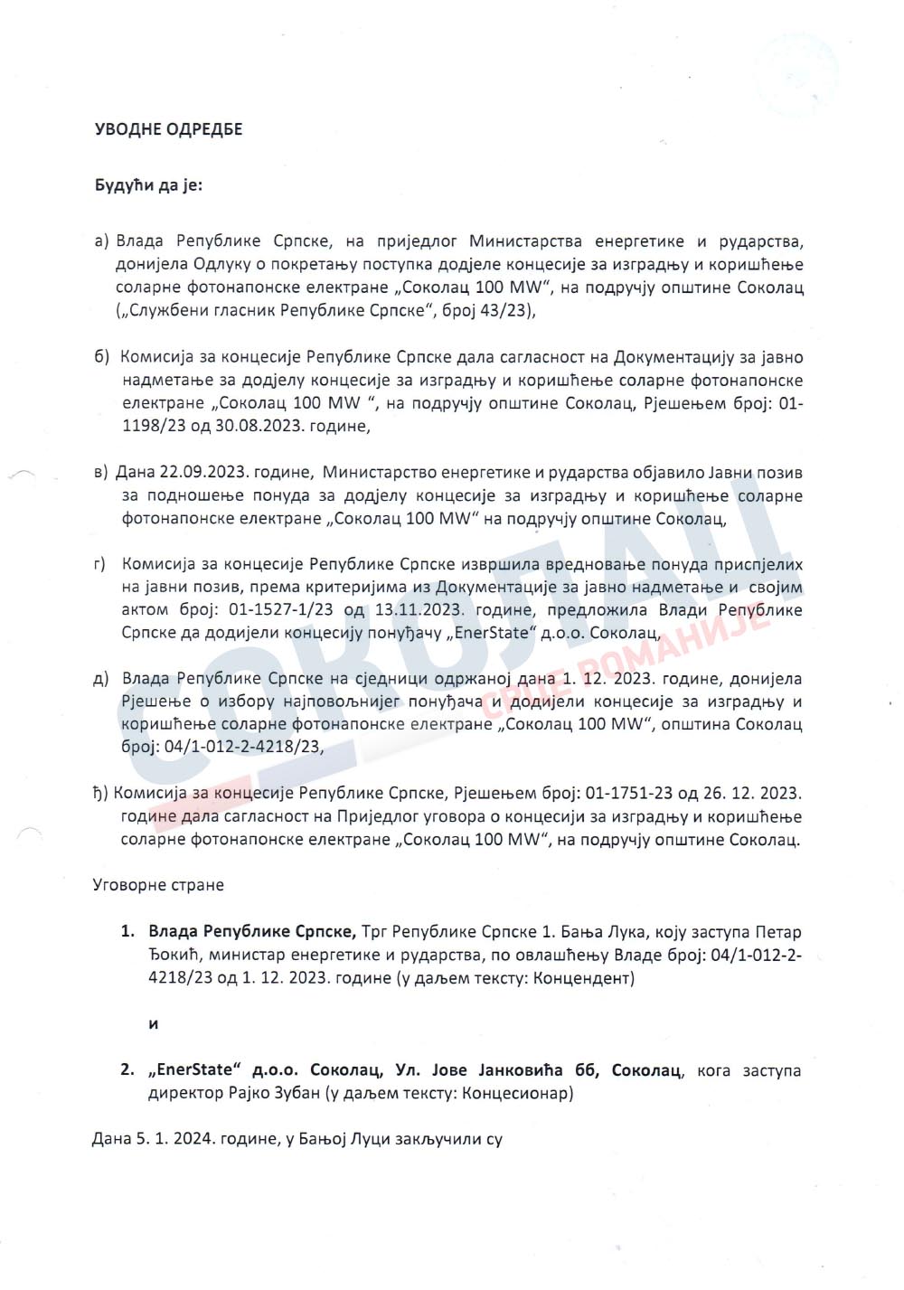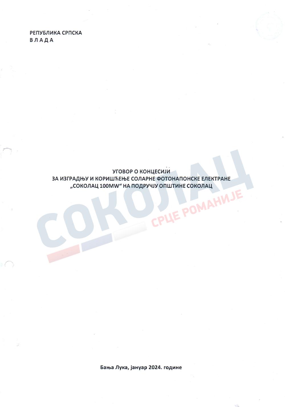 Да подсјетио, Влада Републике Српске је на 47.сједници одржаној 01.12.2023. донијела Рјешење о избору најповољнијег понуђача и додјели концесије за изградњу и кориштење соларне фотонапонске електране „Соколац 100 MW“ на подручју општине Соколац, а исто је објављено у Службеном гласнику Републике Српске 26.децембра 2023.године.