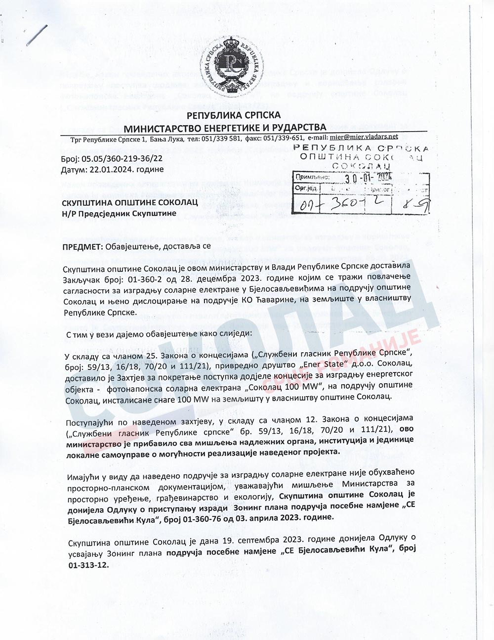 С обзиром да се у Закључку усвојеном од стране скупштинске већине захтјевало да се соларна електрана дислоцира на подручје КО Ћаварине, јасно је да би једна таква одлука у потпуности стопирала цијели пројекат, што је потврдило и Министарство енергетике и рударства Републике Српске у допису упућеном 22.јануара ове године предсједнику Скупштине општине Соколац.