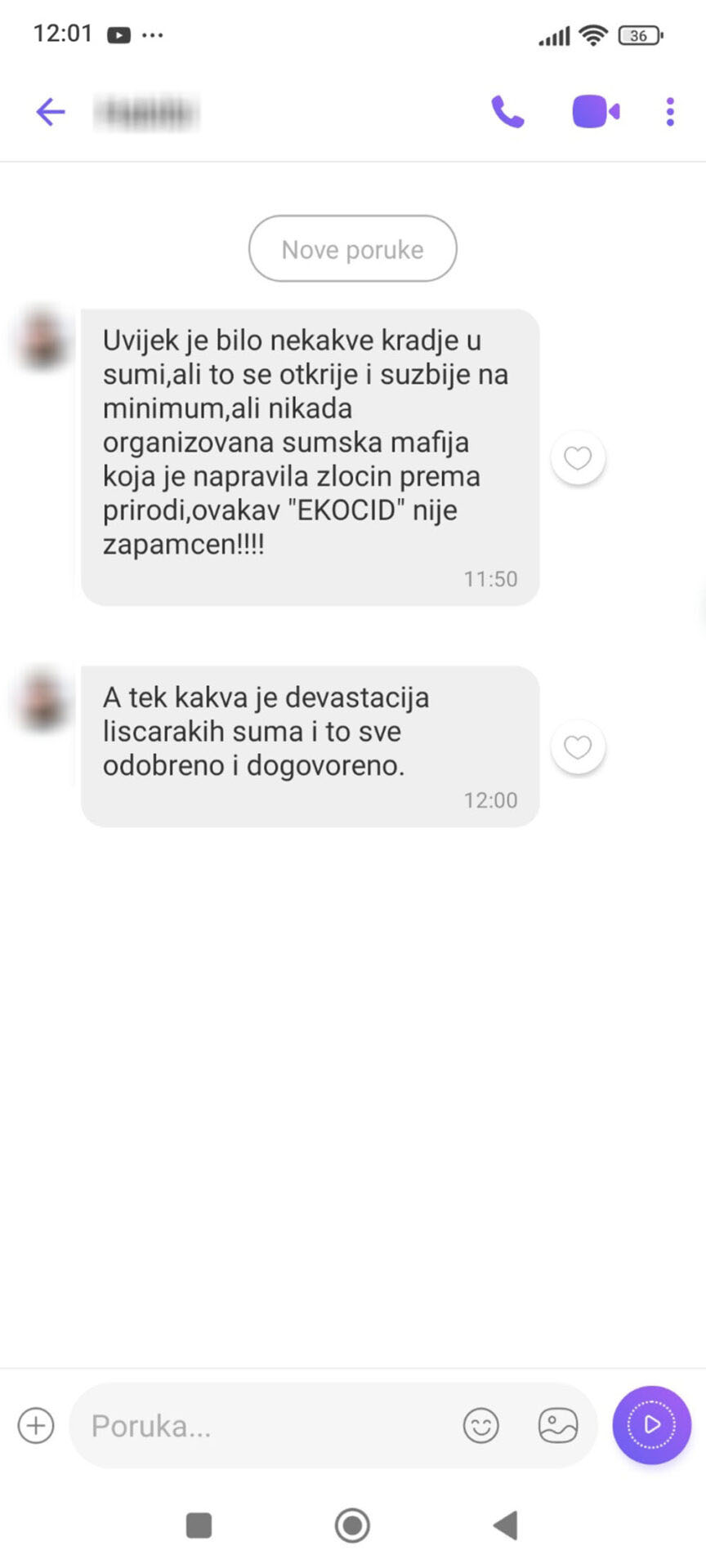 „Увијек је било некакве крађе у шуми, али то се открије и сузбије на минимум, али никада организована шумска мафија која је направила злочин према природи, овакав „ЕКОЦИД“ није запамћен! А тек каква је девастација лишћараких шума и то све одобрено и договорено.“ стоји у поруци.