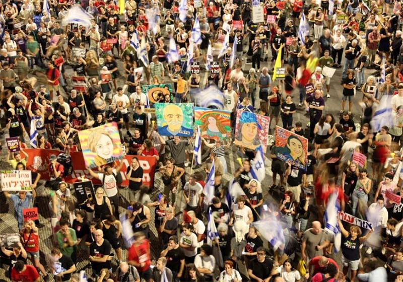 У Тел Авиву, Јерусалиму и другим израелским градовима у суботу су одржане масовне демонстрације са којих је израелска влада позвана да прихвати договор о размени талаца и одржавање превремених избора, а протести су били праћени сукобима са снагама безбједности и насилним хапшењима.