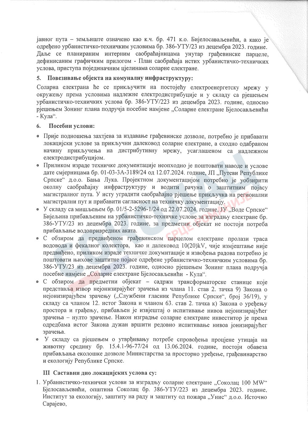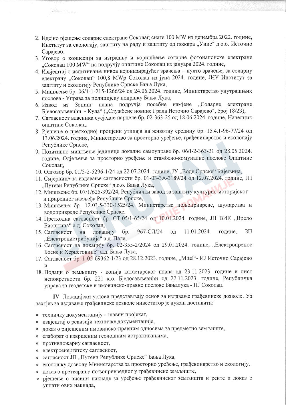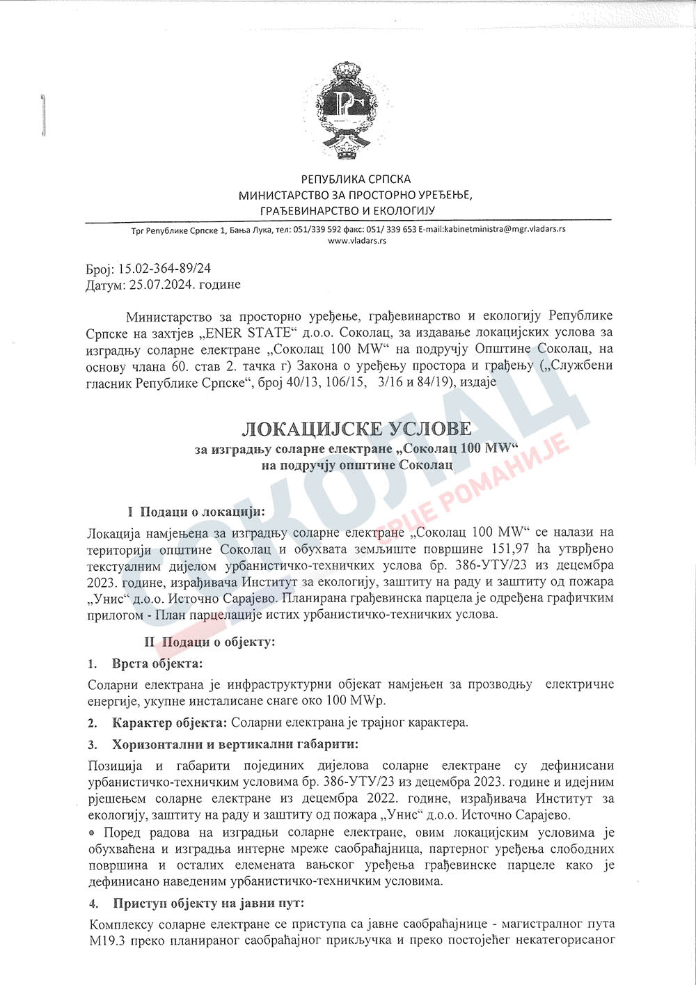 Влада Републике Српске, Министарство за просторно уређење, грађевинарство и екологију издало је ЛОКАЦИЈСКЕ УСЛОВЕ за изградњу соларне електране „Соколац 100 MW“ нa подручју општине Соколац, саопштено је из кабинета начелника општине Соколац.