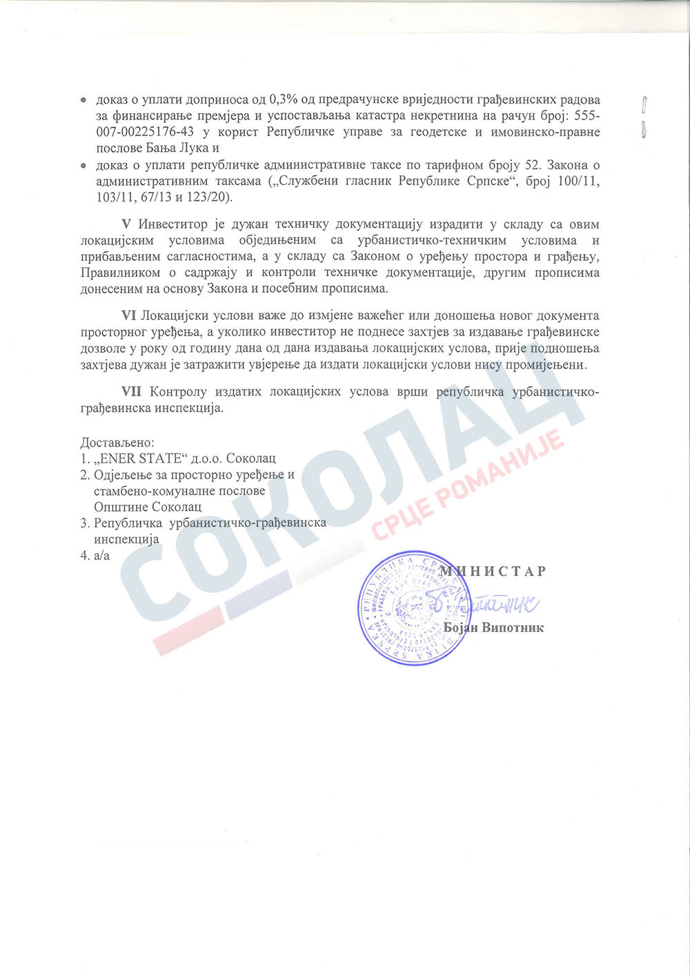 „У име грађана Сокоца упућујем велику захвалност Предсједнику, Влади Републике Српске, владиним комисијама, институтима, агенцијама, Правобранилаштву Републике Српске, министру Сташи Кошарцу, НОС-у и Електропреносу БиХ што су подржали и професионално се односили према овом капиталном пројекту за Соколац, Источно Сарајево, Републику Српску и БиХ. Хвала свима који су допринијели да се реализује ова идеја. Соколац побјеђује!“ рекао је начелник Бјелица.
