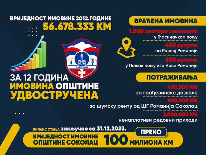 Према подацима који су у посједу портала „Соколац-срце Романије“ у протеклих 12 година имовина општине Соколац је удвостручена. Наиме, 2012. општинска имовина вриједила је 56.678.333 КМ, док према књигама биланса стања на дан 31.12.2023.године та вриједност износи преко 100 милиона КМ.