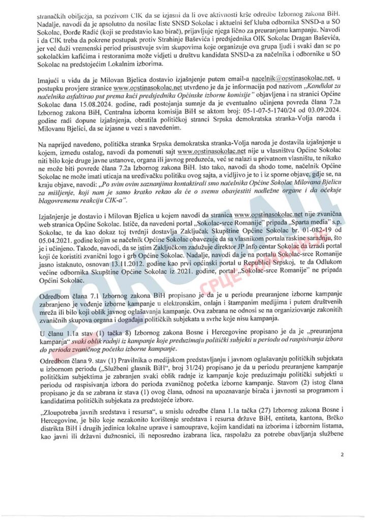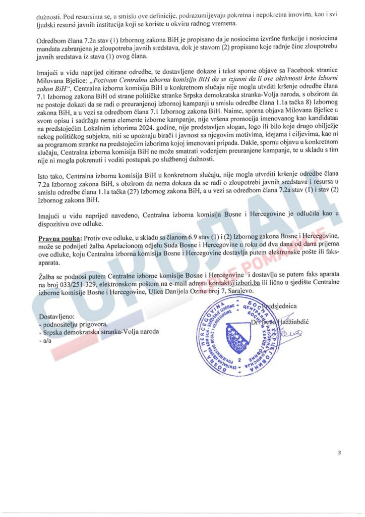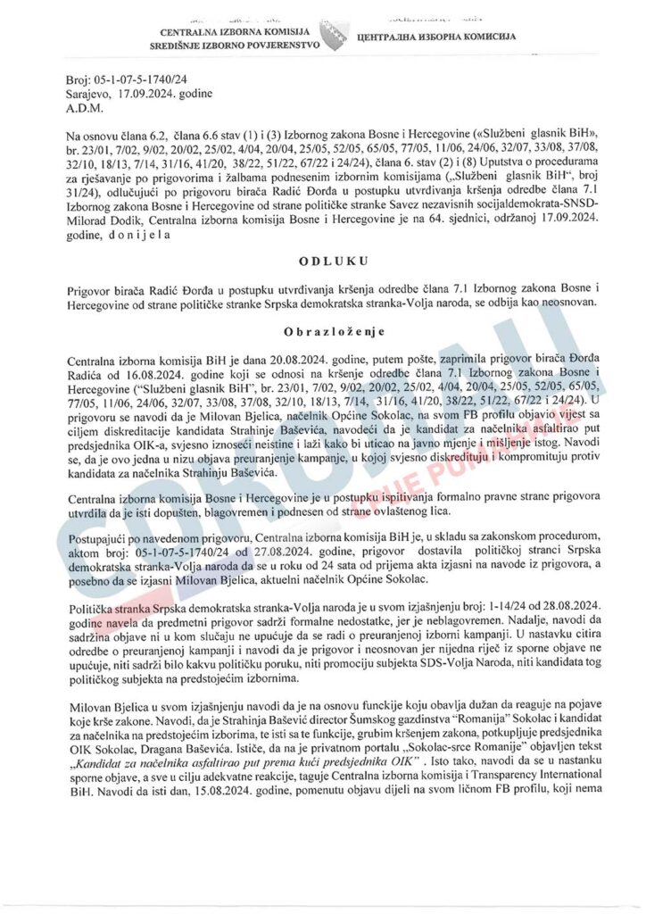 Централна изборна комисија БиХ на данашњој 64.сједници ЈЕДНОГЛАСНО је ОДБИЛА ПРИГОВОР носиоца листе СНСД-а у Сокоцу Ђорђа Радића због наводне преурањене кампање Милована Бјелице, кандидата за начелника општине Соколац, сазнаје портал „Соколац-срце Романије“.