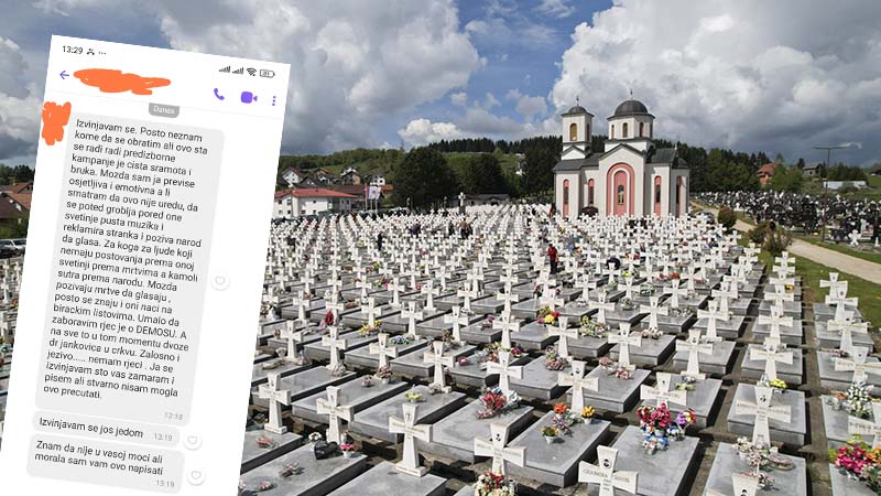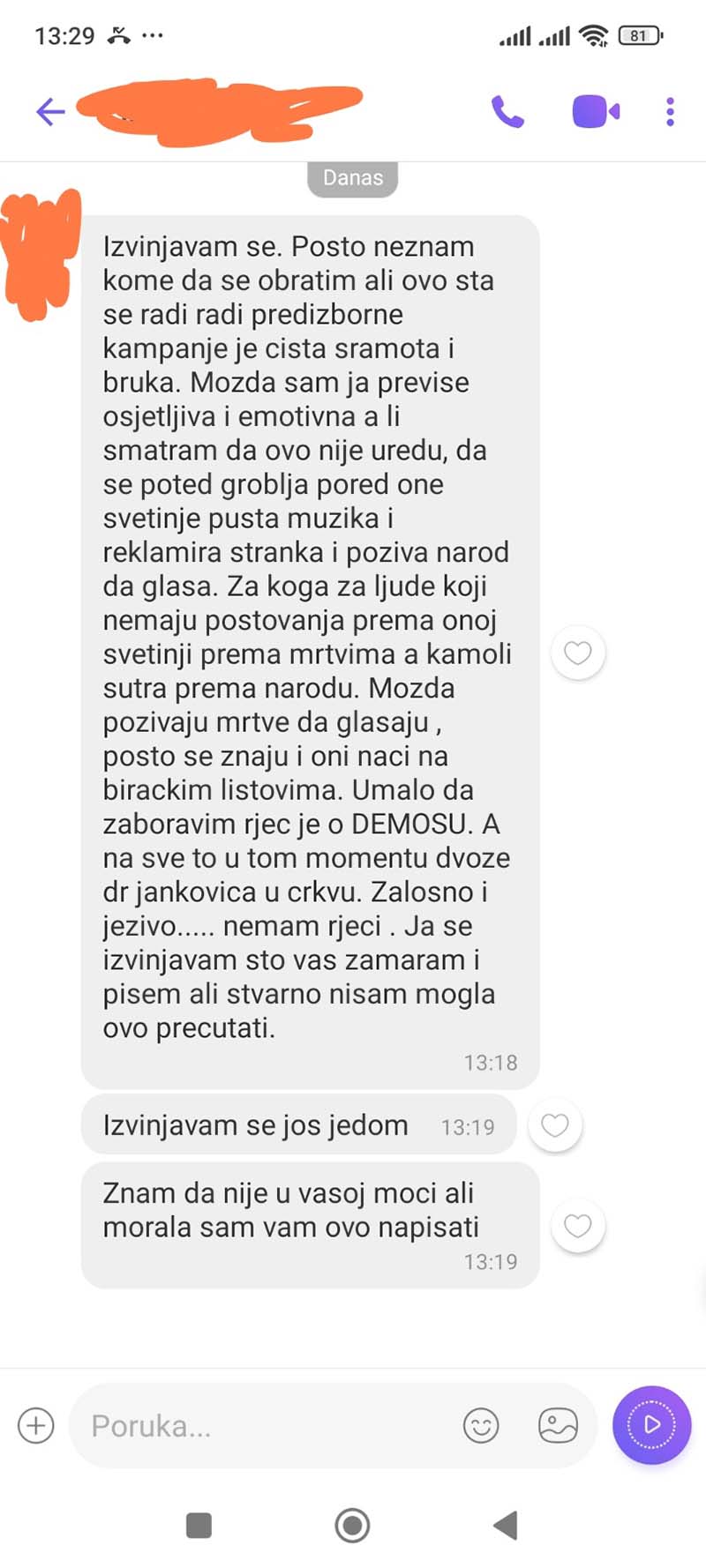 „Пошто не знам коме да се обратим али ово шта се ради ради предизборне кампање је чиста срамота и брука. Можда сам ја превише осјетљива и емотивна, а ли сматрам да ово није уреду, да се поред гробља поред оне светиње пушта музика и рекламира странка и позива народ да гласа. За кога за људе који немају поштовања према оној светињи према мртвима, а камоли сутра према народу. Можда позивају мртве да гласају, пошто се знају и они наћи на бирачким листовима. Умало да заборавим ријеч је о ДЕМОСУ. А на све то у том моменту довозе Др Јанковића у цркву. Жалосно и језиво….. немам ријечи. Ја се извињавам што вас замарам и пишем али стварно нисам могла ово прећутати. Знам да није у вашој моћи али морала сам вам ово написати“ – стоји у писмо упућеном нашој редакцији.