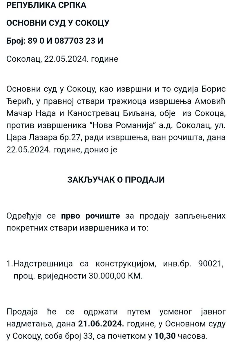 Како се из дописа може видјети Основни суд у Сокоцу је 22.маја ове године у правној ствари тражиоца извршења Амовић Мачар Наде и Каностревац Биљане, против извршеника „Нова Романија“ а.д. Соколац донио закључак о продаји надстрешнице са конструкцијом процијењене вриједности 30.000 КМ. Како се претпоставља, продаја је извршена 21.јуна на првом рочишту.