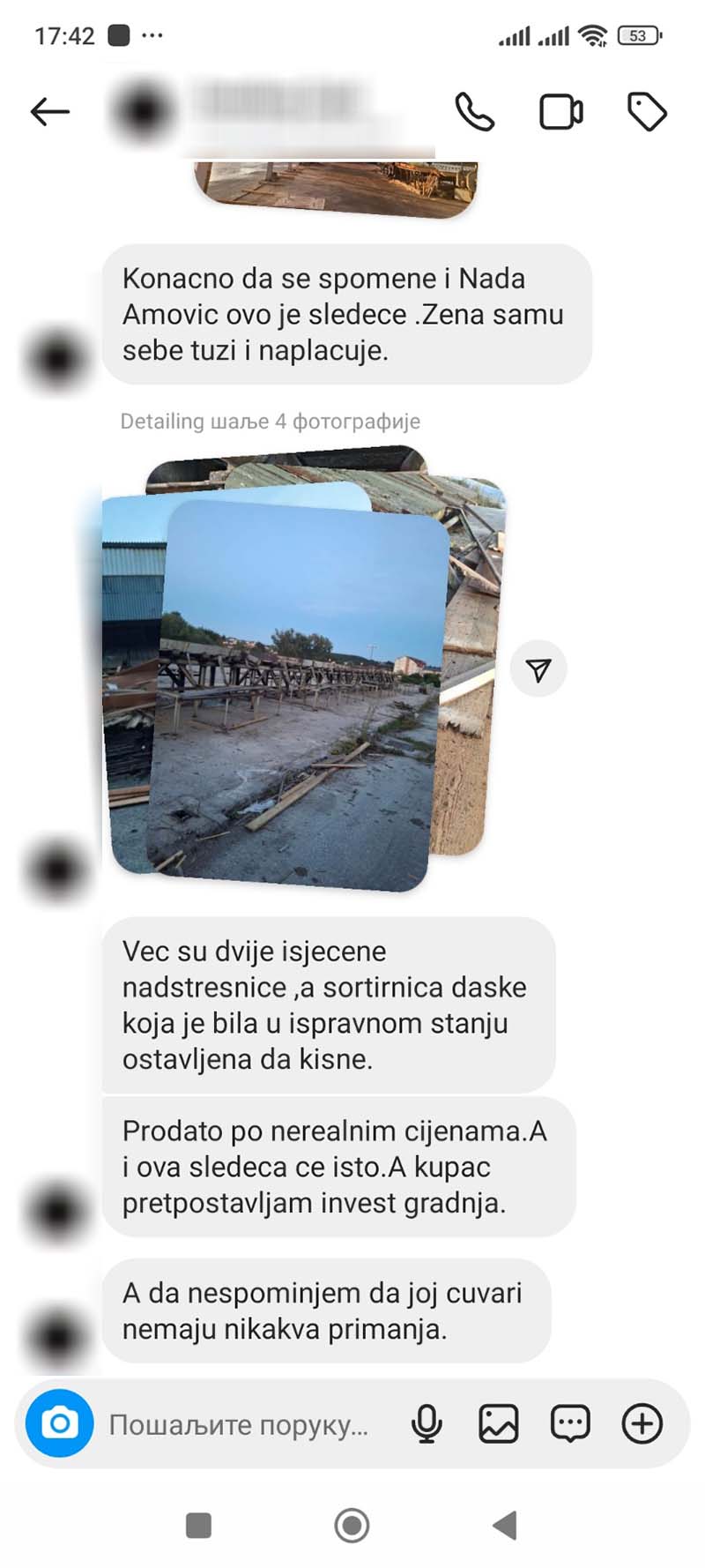 „Коначно да се спомене и Нада Амовић (Мачар). Жена саму себе тужи и наплаћује. Већ су двије исјечене надстрешнице, а сортирница даске која је била у исправном стању остављена да кисне. Продато по нереалним цијенама. А и ова следећа ће исто. А купац претпостављам Инвест Градња. А да неспомињем да јој чувари немају никаква примања“ – наводи се у допису.