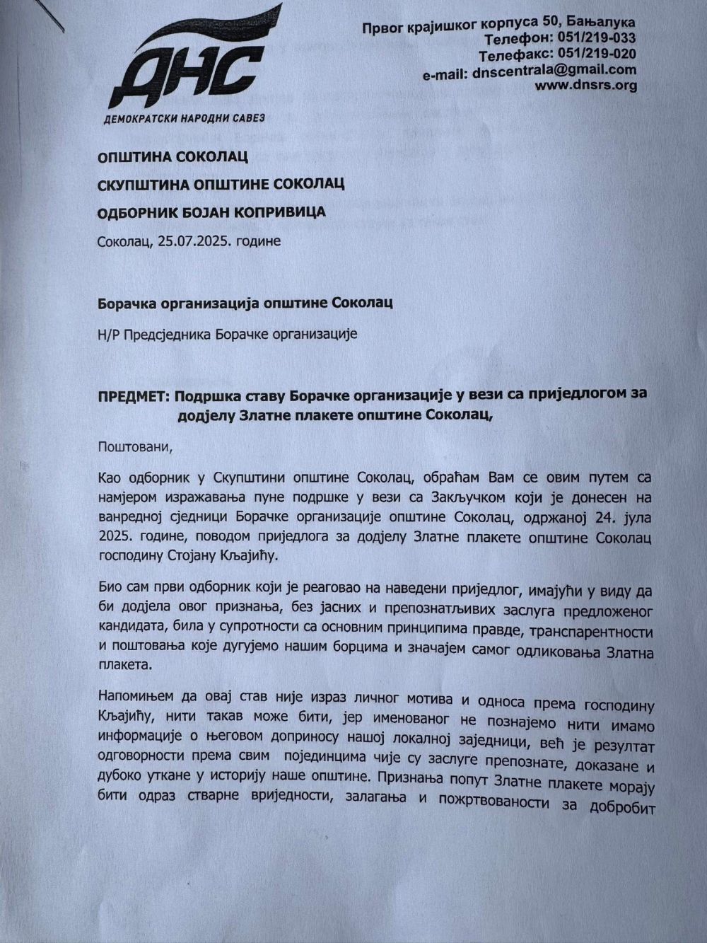 Да ваша прича о страначком иступању нема утемељење, показује и то што исти став, као и Борачка организација општине Соколац, има и ОО ДНС, чије писмо подршке ћемо објавити испод, као и слике подршке наших људи у коментарима. Такође, као што смо већ писали и објавили, против ове додјеле био је и Милан Јоловић-Легенда, одборник СНСД и командант Вукова са Дрине, чији је господин Кљајић пријатељ, као и клуб одборника СДС. Између осталог, да ваше тврдње немају утемељење представља и чињеница да су сви други приједлози усвојени једногласно.