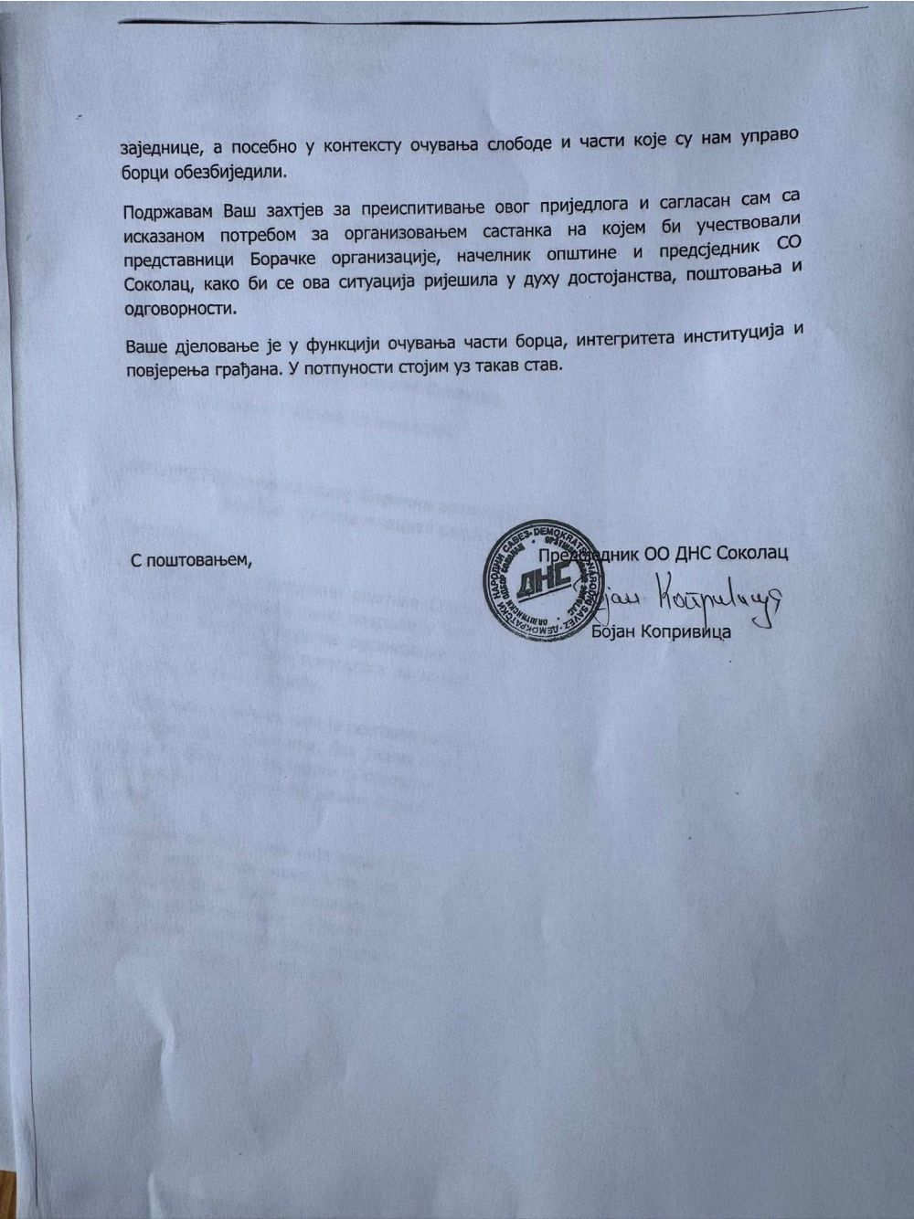 Што се тиче ваших ријечи у којима изражавате дубоко разочарење чињеницом да данашњу Борачку организацију општине Соколац води особа која у вријеме рата није ни била рођена, та иста особа није пала са неба, нити је неко други поставио, већ је изабрала Скупштина Борачке организације општине Соколац. Два одлична кандидата, који су били противкандидати овој особи, одрекла су се кандидатуре у корист те исте особе, што довољно говори. Жао нам је што и Ви не дијелите исто мишљење и што људе гледате кроз политичку припадност, а не према људским квалитетима.