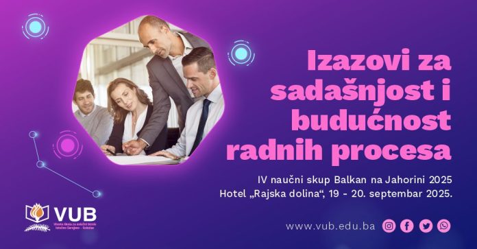 Висока школa за услужни бизнис Источно Сарајево – Соколац /ВУБ/ 19. и 20. септембра 2025. године на Јахорини, у хотелу „Рајска долина“ организује 4. научни скуп „Балкан на Јахорини 2025″, на тему „Изазови за садашњост и будућност радних процеса“.