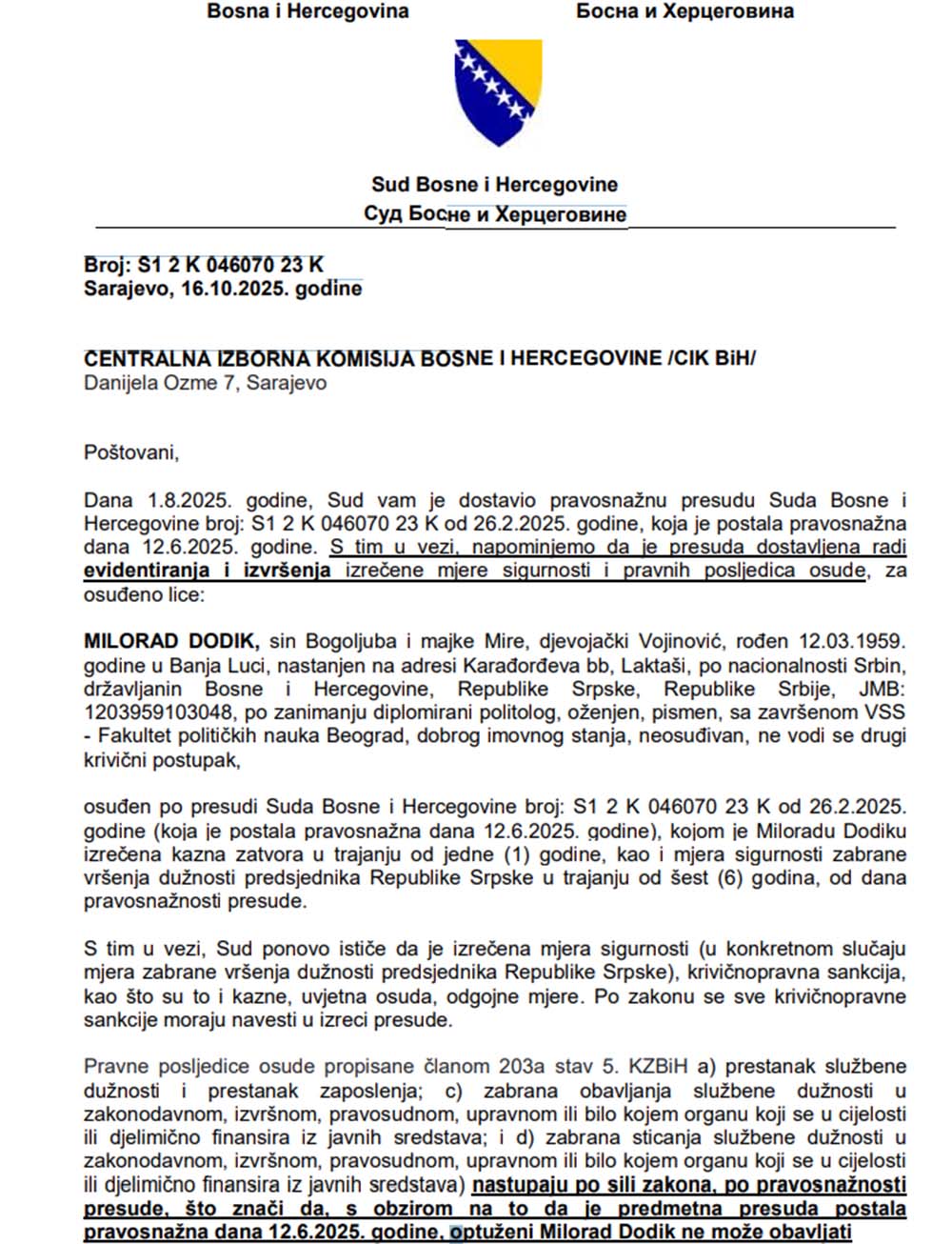“Правне посљедице осуде прописане чланом 203а став 5. КЗБиХ а) престанак службене дужности и престанак запослења; ц) забрана обављања службене дужности у законодавном, извршном, правосудном, управном или било којем органу који се у цијелости или дјелимично финансира из јавних средстава; и д) забрана стицања службене дужности у законодавном, извршном, правосудном, управном или било којем органу који се у цијелости или дјелимично финансира из јавних средстава) наступају по сили закона, по правоснажности пресуде, што значи да, с обзиром на то да је предметна пресуда постала правоснажна дана 12.6.2025. године, оптужени Милорад Додик не може обављати ниједну од дужности или послова који су наведени у тачкама од а), ц) и д) члана 203а став 5. КЗБиХ, а што сте и сами констатовали у вашој одлуци од 6.8.2025. године”, стоји у допису.