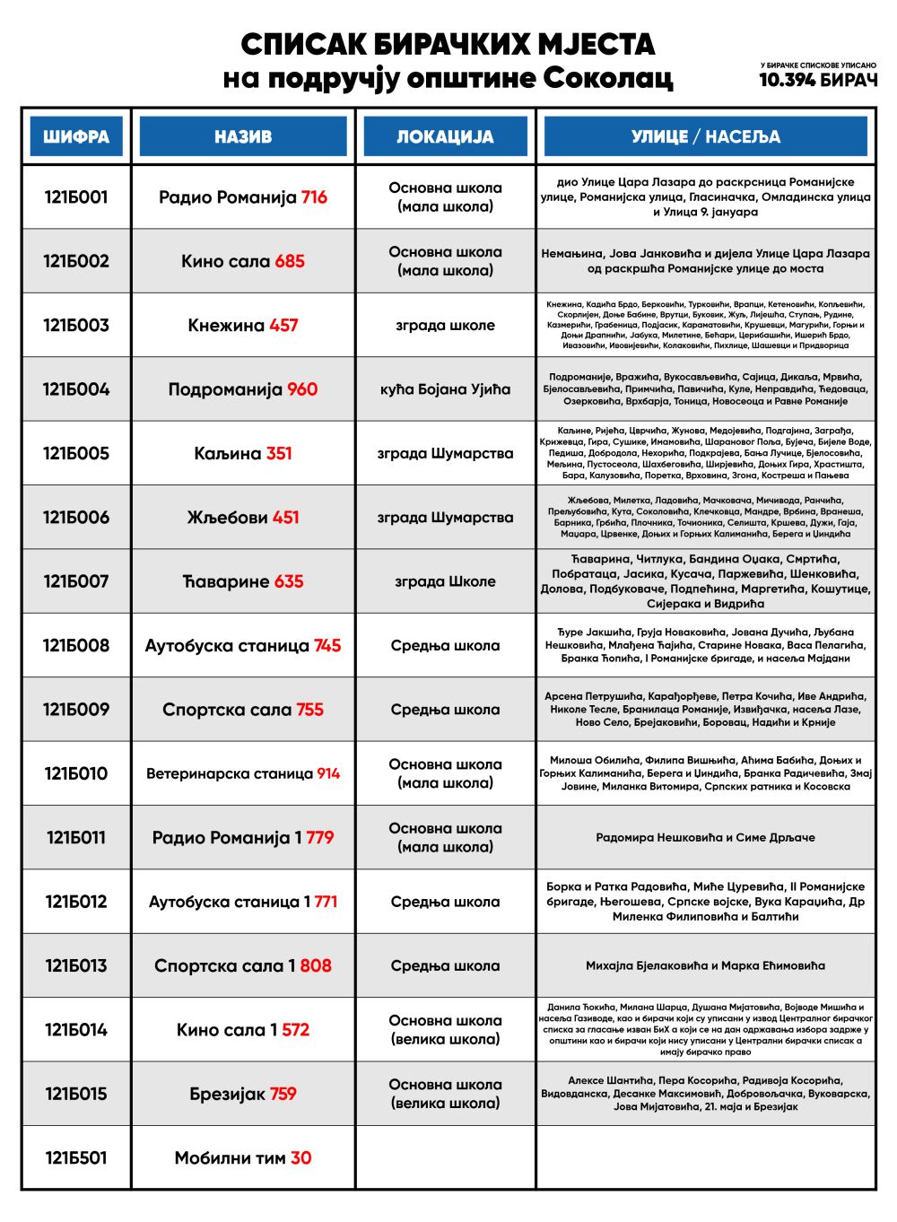 Грађани који имају право гласа на подручју општине Соколац гласаће на 15 редовних бирачких мјеста и једном бирачком мјесту за гласање у одсуству.
